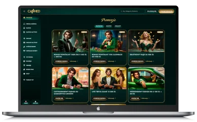 Casino Cashed ma nowoczesny, czytelny design. Dominuje ciemna kolorystyka z kontrastowymi akcentami, co wygląda elegancko i nie męczy oczu, obejmując gry i hazard online. Na górze ekranu znajdziesz główne menu. Możesz stąd przejść do gier kasynowych, zakładów sportowych, promocji, turniejów oraz sekcji VIP. Po prawej stronie znajdują się opcje rejestracji i logowania.