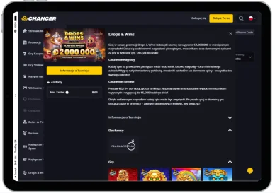 Sprawdziłem dokładnie sekcję Turnieje w kasynie internetowym i obecnie znalazłem tam jedną naprawdę gorącą propozycję: Drops & Wins. Jest to globalna promocja, w której co miesiąc rozdzielane są ogromne pule nagród. Aby wziąć udział, wystarczy postawić zakład na jednej z ponad 50 kwalifikujących się gier. Im wyższe mnożniki wygranych uda się osiągnąć, tym wyżej gracz awansuje w rankingu. Codziennie rozlosowywane są Chancer.bet bonusy pieniężne, a co tydzień odbywają się turnieje z jeszcze większymi pulami nagród.