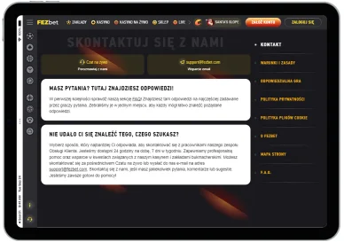 Dział wsparcia w kasynie online jest dostępny 24/7, zapewniając graczom szybką i skuteczną pomoc w każdej sytuacji. Skontaktować się z supportem FezBet Kasyno online można za pomocą czatu live lub adresu e-mailowego. Warto również zaznaczyć, że FezBet udostępnia obszerną sekcję FAQ, w której gracze mogą znaleźć odpowiedzi na najczęściej pojawiające się pytania dotyczące rejestracji w FezBet Casino, płatności, gier i innych aspektów korzystania z platformy hazardowej.