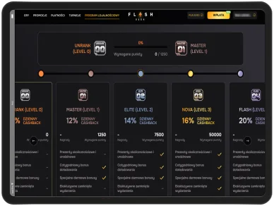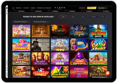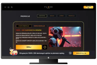 Na samej górze strony głównej kasyna online znajdziemy odnośniki do następujących podstron: Gry Hazardowe, Promocje, Płatności, Turnieje, Klub VIP, Bonusy. W prawym górnym rogu umieszczono przyciski Zarejestruj się, Zaloguj się. Pomarańczowa ikona czatu znajduje się w lewym dolnym rogu. FlashDash Casino opinie podkreślają łatwość nawigacji i atrakcyjny wygląd strony.