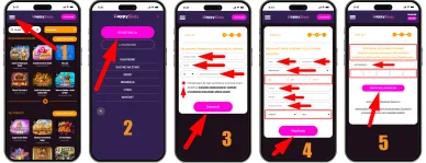 - Następnie gracz musi nacisnąć różowy guzik HappySlots Depozyt. Znajdzie go w prawym górnym rogu;