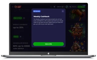 Cotygodniowy cashback w LazyBar Kasyno to najlepsza okazja, aby odzyskać część poniesionych strat. Im bardziej aktywni będziemy w kasynie online, tym wyższy poziom VIP osiągniemy i tym większy procent cashbacku będziemy mogli otrzymać.