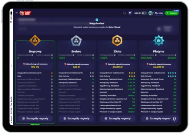 - Najwyższy poziom — Platyna — to nagroda 50 000 PLN i wszystkie korzyści dostępne dla niższych poziomów.