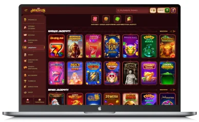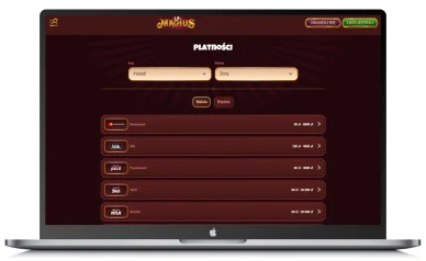Strona kasyna Magius wyróżnia się nowoczesnym designem, w którym dominują ciemne odcienie z kontrastującymi złotymi i czerwonymi akcentami. Taki wygląd Casino Magius tworzy elegancką atmosferę, sprzyjającą rozgrywce. Menu znajduje się na górze strony i umożliwia szybki dostęp do sekcji takich jak: