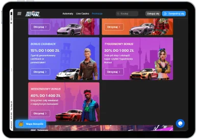 - Mapa Bonusów — dodatkowe atrakcje, które Need For Spin udostępnia w celu zachęcenia graczy do kontynuowania rozgrywki przez dłuższy czas w kasynie.