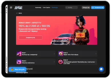 - Bonus od pierwszego depozytu: 110% do 2200 zł + 120 DS. Minimalny depozyt: 100 zł. Limit czasowy: 5 dni. Wymogi obrotu: x45.