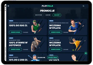 - Playzilla Casino bonus sportowy za pierwszą wpłatę — 100% do 500 zł. Minimalna wpłata: 50 zł. Wymagany obrót: 4x (bonus + depozyt) na kuponach AKO (kurs min. 1.50 / każde zdarzenie) i kuponach pojedynczych (kurs min. 2.0).