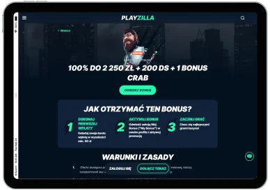 - Kasynowy Playzilla bonus za rejestrację. Gracz, który zasili konto kwotą min. 90 zł, może maksymalnie otrzymać 2250 zł plus 200 DS. Jeśli wpłaci do kasyna 45 zł, to otrzyma 1 Bonus Crab. Wartość premii: 100% od depozytu. Środkami bonusowymi i depozytem należy obrócić 35 razy, a wygranymi z DS — 45 razy.