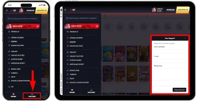 U góry ekranu znajdziemy przycisku służące do rejestracji oraz logowania. Na jego środku widzieć będziemy dostępne aktualnie bonusy w ofercie promocyjnej. Natomiast nieco niżej znajdziemy najlepsze gry hazardowe dostępne w ofercie. Do tego dochodzi menu po lewej stronie, które można włączyć przyciskiem w lewym górnym rogu. U jego dołu znajdziemy ikonkę czatu na żywo.