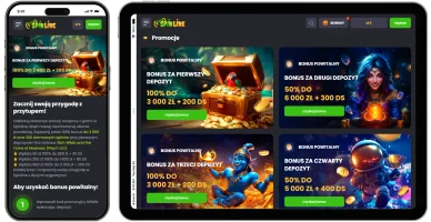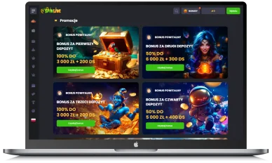 Spinline Casino online nagradza każdego świeżo upieczonego użytkownika hojnym pakietem powitalnym, który składa się z czterech najlepszych bonusów od depozytu. Ogólne warunki kasynowych bonusów powitalnych: wymóg obrotu: 40x; minimalna wpłata: 90 zł (100 DS plus środki bonusowe) i 435 zł (200 DS i premia od wpłaty); czas na aktywację: 3 dni od wpłaty depozytu; czas na obrót bonusem: 7 dni.