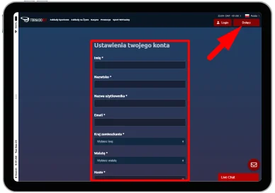 - Kliknięcie przycisku "Zarejestruj się": przycisk ten znajduje się w prawym górnym rogu strony głównej Tornado bet. Po kliknięciu otworzy się formularz rejestracyjny.
