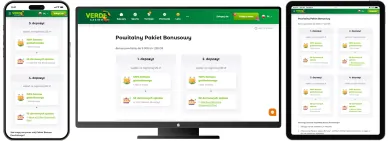 W przypadku doładowania konta kwotą od 120 zł typer może liczyć na bonus o wartości 100% od depozytu do 2000 zł. Użytkownik, który złoży depozyt w wysokości min. 200 zł, otrzyma bonus Verde casino o wartości 120% od wpłaty do 4000 zł. Warunki obrotu bonusem: 10x; zakład SOLO z kursem min. 1.5; zakład AKO na wyniki co najmniej 2 zdarzeń każde z kursem min. 1.5.