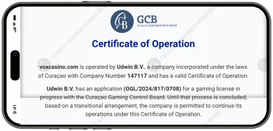 Polski gracz kasynowy, który chce założyć konto w Vox Casino i zastanawia się, czy jest ono wiarygodne i uczciwe, może samodzielnie na samym dole oficjalnej strony internetowej kasyna sprawdzić właściciela (Udwin B.V.), numer licencji (8048/JAZ2023-044) i nazwę organu, który ją wydał. Ważna licencja wydana przez renomowany organ regulacyjny, taki jak rząd Curaçao jest gwarancją tego, że klub hazardowy jest wypłacalny i legalny.