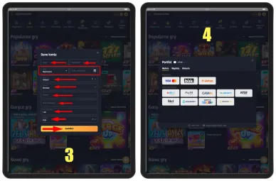 - Wypełnienie danych osobowych. W formularzu rejestracyjnym należy podać następujące dane: e-mail, nazwę użytkownika, hasło, imię, nazwisko, adres zamieszkania, datę urodzenia, płeć, numer telefonu. Na tym etapie można również podać kod bonusowy.