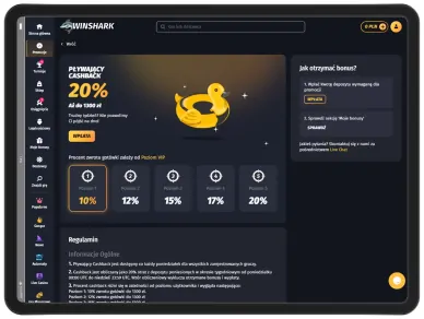 Każdy poniedziałek to okazja do odrobiny ulgi w WinShark Casino dzięki promocji Pływający Cashback, która jest dostępna dla wszystkich zarejestrowanych graczy z Polski i zagranicy. Procent zwrotu zależy od poziomu użytkownika w kasynie online: