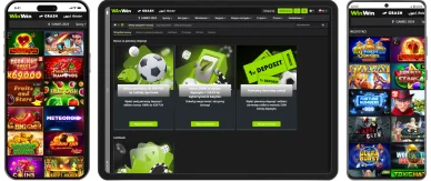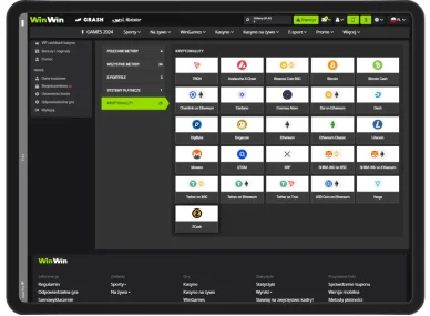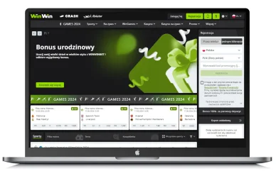 Tuż po wejściu na stronę kasyna zobaczymy przed sobą banery, po których naciśnięciu zostaniemy przekierowani do podstron z dostępnymi bonusami. Na samej górze znajdują odnośniki do wszystkich sekcji, w tym Sporty, Gry Crash, Najlepsze WinGames, Kasyno WinWin. W górnym prawym rogu umieszczono przyciski Zaloguj się, Rejestracja, Aplikacja, Płatności. W stopce znajdziemy m.in. linki do Regulaminów.