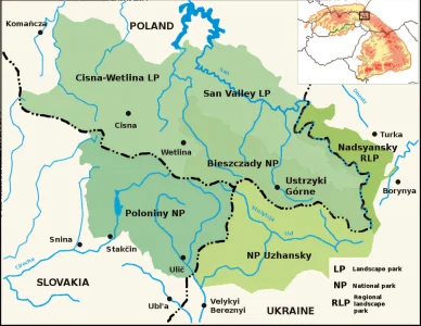 - Polska część: Bieszczadzki Park Narodowy obejmuje 29,20 tys. ha (86% lasy, 6% łąki, 8% inne ekosystemy);