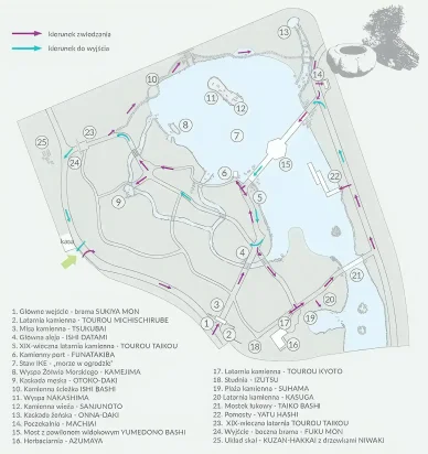 Spacer rozpoczyna się przy głównej bramie ogrodu Sukiya Mon. Stąd ścieżka prowadzi w stronę mostu Yumedono Bashi, który malowniczo rozciąga się nad stawem. Warto robić, idąc przez Ogród Japoński Wrocław zdjęcia mijanych kompozycji. Przechodząc wzdłuż brzegu, ku męskiej kaskadzie Otoko-daki, dochodzi się do żeńskiej Onna-daki. Później można odpocząć przy pawilonie oczekiwania Machiai, a następnie wejść na most i przejść do pawilonu Azumaya, by potem zakończyć wędrówkę przy bramie Fuku Mon.