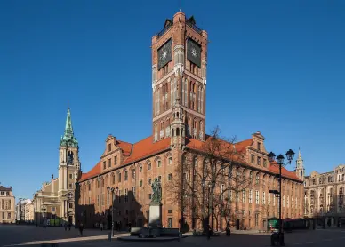 - Toruński ratusz, zbudowany w XIV wieku, jest jednym z najlepszych przykładów architektury gotyckiej w Polsce. Znajduje się w samym sercu Starego Miasta i niegdyś służył jako centrum władz miejskich. Ratusz imponuje niesamowitą skalą i detalami architektonicznymi, w tym wysoką wieżą i eleganckimi fasadami. Był również wykorzystywany jako rynek, sąd i miejsce wydarzeń publicznych.