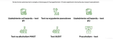 Ośrodek Dom Rehab Center przygotował dla odwiedzających stronę kliniki specjalne testy, dzięki którym można sprawdzić, jaki dana osoba ma stosunek do danego tematu, czy w jej przypadku istnieje ryzyko uzależnienia oraz, czy potrzebuje leczenia.