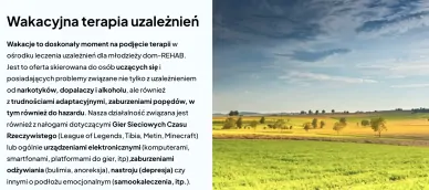 Na terapię wakacyjne Dom Rehab Robert Banasiewicz zaprasza wszystkie osoby, które mogą poddać się leczeniu wyłącznie w czasie wolnym od nauki, czyli w miesiącach letnich. Na leczenie mogą zgłosić się osoby mające problemy z uzależnieniem od alkoholu, dopalaczy, narkotyków, a także od komputera.