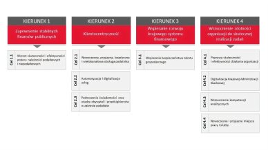 Minister właściwy do spraw finansów publicznych określa czteroletnie kierunki działania i rozwoju KAS, wskazując misję, wizję, wartości oraz cele do osiągnięcia: