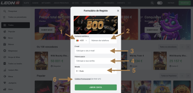 - Caso o jogador possua um código promocional Leon casino, poderá indicá-lo abaixo.