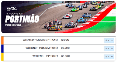 - Bilhete VIP permite circular entre a torre VIP, o paddock e a tribuna principal. Dá acesso ao PIT WALK e ao Grid WALK. Preço: 60 €