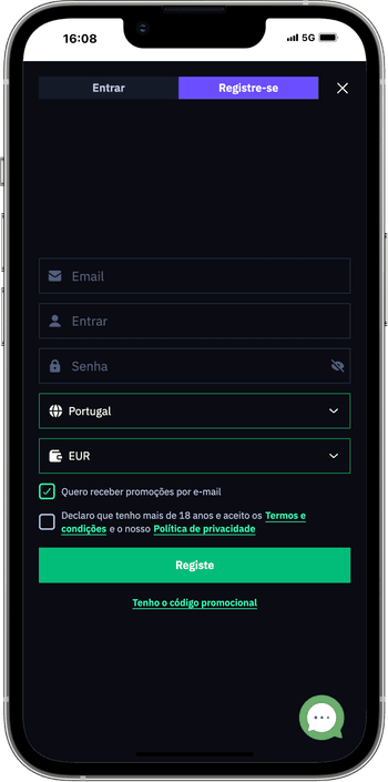 - Insira os dados: Informe um email válido, crie um nome de utilizador, crie uma palavra-passe e defina questões de país e moeda (Portugal e euro).