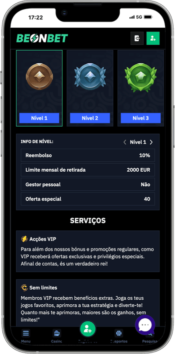 O programa de fidelidade da casa conta com 5 níveis e muitos tipos de recompensas para os jogadores. Desde a conclusão do registo, os jogadores podem acompanhar a evolução através dos níveis no programa. A evolução acontece através das próprias atividades nos jogos de casino, quanto mais jogo, mais avanço!