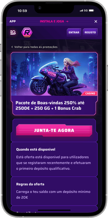 Apesar de não haver um Roby casino no deposit bonus, a marca oferece um generoso bónus de boas-vindas aos novos jogadores, com uma oferta válida para os três primeiros depósitos, num total de 250% até 2500€ e 250 rodadas grátis +1 bonus crab.