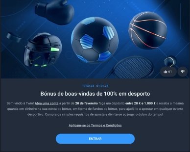 O Twin Casino também atende às necessidades dos apostadores desportivos. O casino tem uma oferta exclusiva para este tipo de utilizadores. Ao depositar pelo menos 20 euros, poderá obter 100% de bónus de inscrição. Isto significa que, se depositar 20 euros, receberá 200 euros no total para apostar em desportos. É uma excelente oportunidade para os fãs de desporto melhorarem a sua experiência de apostas e desfrutarem de mais opções com fundos extra.