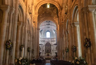 A nave coberta por uma abóbada cilíndrica e a galeria superior em arco, denominada triforium, conferem ao edifício um aspeto específico. Os raios de luz penetram pelos vãos das janelas em rosácea da fachada ocidental. Os corredores laterais da nave também têm janelas, mas são bastante estreitos.