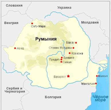 Самая большая страна юго-востока Европы граничит с четырьмя государствами - Украиной, Венгрией, Болгарией и Сербией. Румыния имеет выход к морю: через ее черноморские порты ведётся оживленная торговля со всей Европой, частью азиатских и африканских стран. Ее рельеф состоит из равнинных и гористых местностей. Проходящий через всю румынскую территорию отрезок Карпат состоит из 14 хребтов.