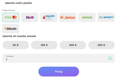 Načini plačila in dviga z minimalnim depozitom 1 evro