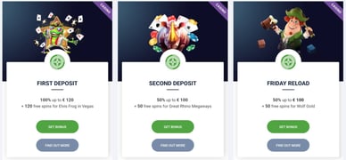 - Bonus 100 % za prvi polog za igralce med 20 € in 120 € ter 120 brezplačnih vrtljajev v igri Elvis Frog in Vegas;
