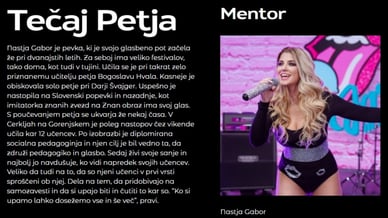 Nastja Gabor ne le poje, ampak tudi poučuje vokalne veščine. Skupaj z možem je ustanovila svoje podjetje, Glasbeni center Balu. Na tečajih se učenci učijo solo petja, skupinskega petja in tudi igranja: