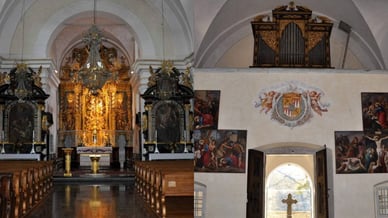 Notranjost cerkve krasijo gotske freske v barokiziranem prezbiteriju.