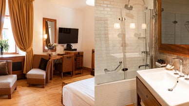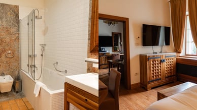 Za večje udobje priporočamo Senior suito. Iz nje se razprostira pogled na grajski stolp in leseni most čez reko. V sobi je velika spalnica s posteljo in kavčem ter nekoliko manjša spalnica za dva otroka. Prostorna in udobna je tudi kopalnica s kadjo s hidromasažo, ločeno prho in dvema umivalnikoma.