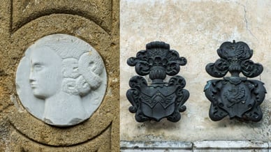 Na preteklost nas spominjata portal, ki je neposredna referenca na renesanso, in marmorni medaljon s profilom dekleta.
