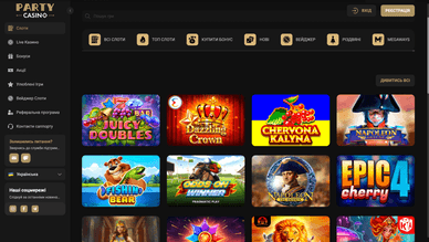 Щодо розваг, то молоде казино Party не поступається іншим реальним казино. Воно пропонує понад 1000 слотів і ще близько тисячі інших азартних ігор. На головній сторінці виділено всього два ключових розділи — слоти та Live.
