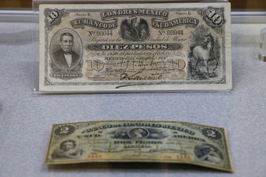 Банкнота в десять песо 1887 року в Національному нумізматичному музеї, Мехіко