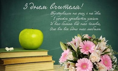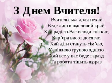Вчителю, сьогодні ми вітаємо вас з вашим святом і хочемо сказати величезне "дякую" за все, що ви робите для нас! Ваша мудрість, терпіння та увага - це справжній дар. Бажаємо вам успіху, міцного здоров'я і щоденних радощів!