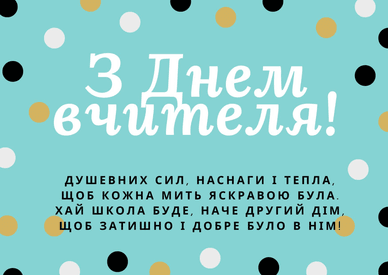 Шановні вчителі! В цей особливий день хочемо щиро подякувати вам за вашу працю, терпіння та мудрість. Ви даруєте нам не лише знання, а й підтримку, мотивацію досягати нових вершин. Бажаємо вам натхнення, здоров'я та щастя!