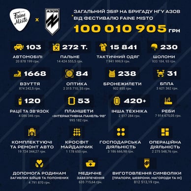 Цьогорічний фест “Файне місто” ставив за мету зібрати п'ять мільйонів гривень для підтримки логістичних та гуманітарних потреб бригади НГУ "Азов", з якою команда "Файного" веде тісну співпрацю з перших днів повномасштабного вторгнення. В рамках благодійної мети, організаторам фесту вдалося зібрати майже 8 мільйонів гривень на допомогу ЗСУ.