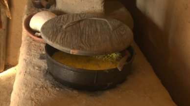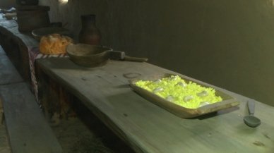 Пластунський курінь на Запорозькій Січі, на столі муляж популярної у козаків страви - тетері