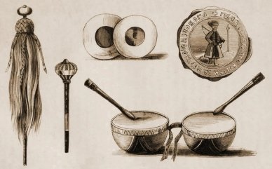 Військові клейноди запорожців: бунчук, булава, литаври з довбишами, печатка. Ілюстрація з «Історії України-Русі» Миколи Аркаса (1912 р.)