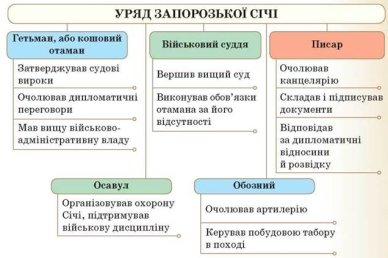 Разом із отаманом обирали військову старшину, тобто уряд Січі. До нього входили суддя (друга особа після кошового отамана), писар (відав усіма письмовими справами Запоріжжя), осавул (стежив за порядком і благополуччям козаків у мирний час), а також курінні отамани (піклувалися про козаків свого куреня).