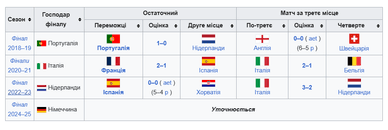 Першим переможцем Фіналу чотирьох стала збірна Португалії у 2019 році, обігравши у фіналі Нідерланди.