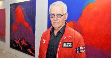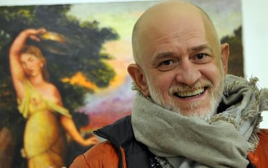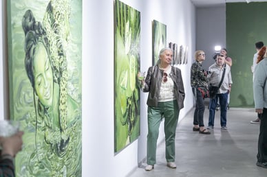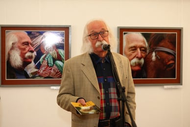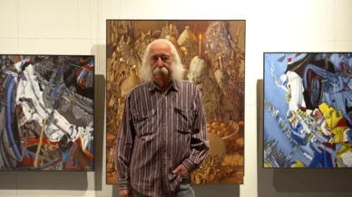 Іван Марчук на фоні експозиції "Секрети геніальності: 100 невідомих творів Івана Марчука" у галереї ARTAREA